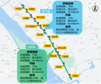 为了最大程度适应道路特性,交警创新性地采用了分段式“绿波”协调策略。根据道路实际条件,将芙蓉北路(兴旺路—兴隆路)科学划分为“桥下段”(兴旺路—高冲路)和“地面段”(新安路—兴隆路),量身定制了不同的通行优化方案。在桥下段,巧妙利用现有的行人二次过街安全岛,成功将全天各时段的信号周期缩短了20秒(高峰由170秒降至150秒,平峰由150秒降至130秒,夜间由120秒降至100秒),让机动车和行人都能减少等待。在地面段,则在充分保障行人一次安全过街的前提下,精心设计了双向通行的“绿波带”,显著提升了南北向车辆的通行连续性。