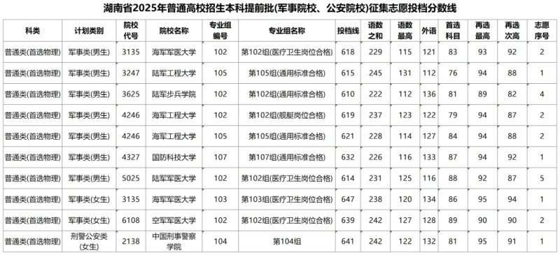 最高647分!湖南省本科提前批(军事院校、公安院校)征集志愿投档分数线出炉