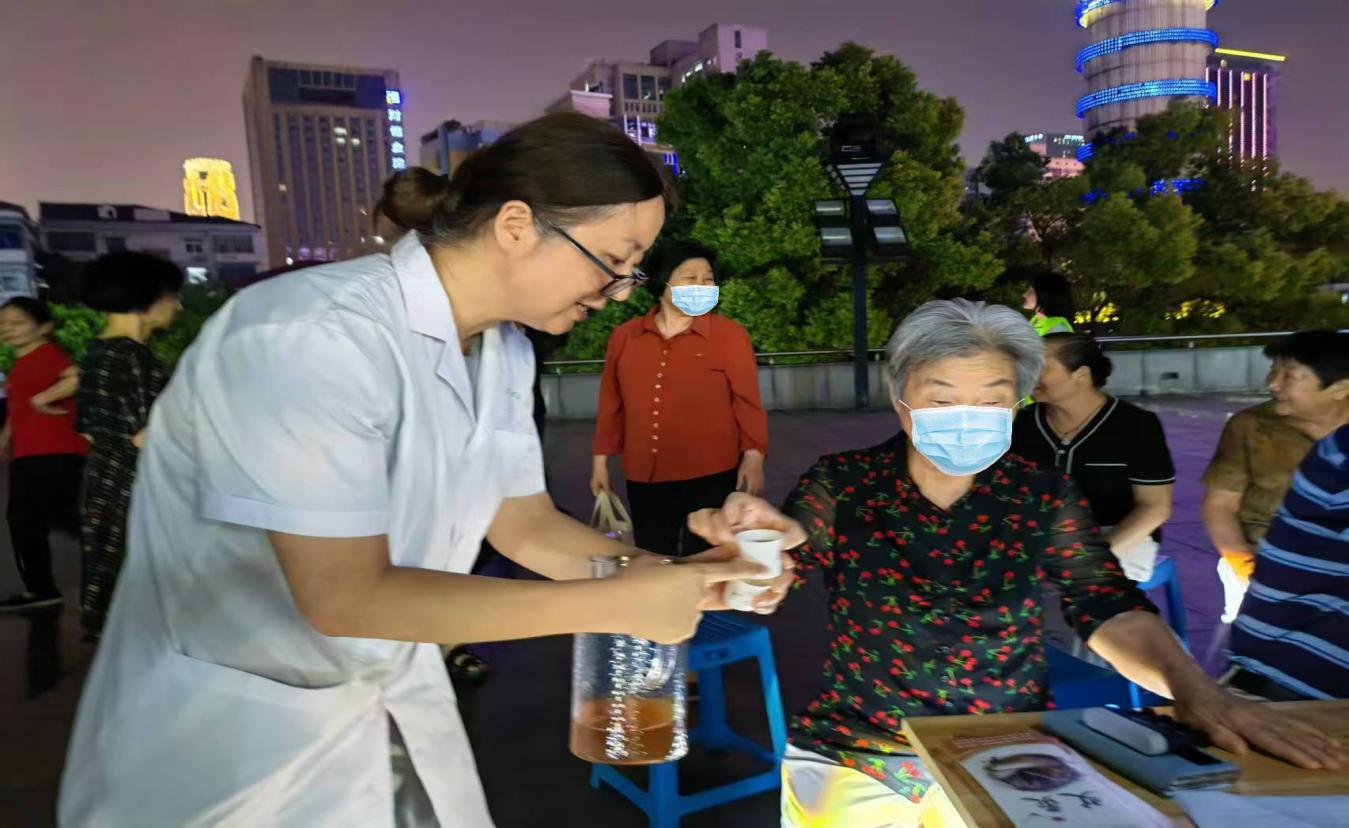 中药养生茶饮和艾灸的馨香吸引着众多前来贺龙体育细致散步的居民们,纷纷上前询问“这是在开展什么活动吗?”城南路中心医务人员回答道:“是呀,不仅可以免费测量血压、体验中医特色诊疗服务、品尝中药养生茶饮,还可以进行中医药知识有奖问答哦!”